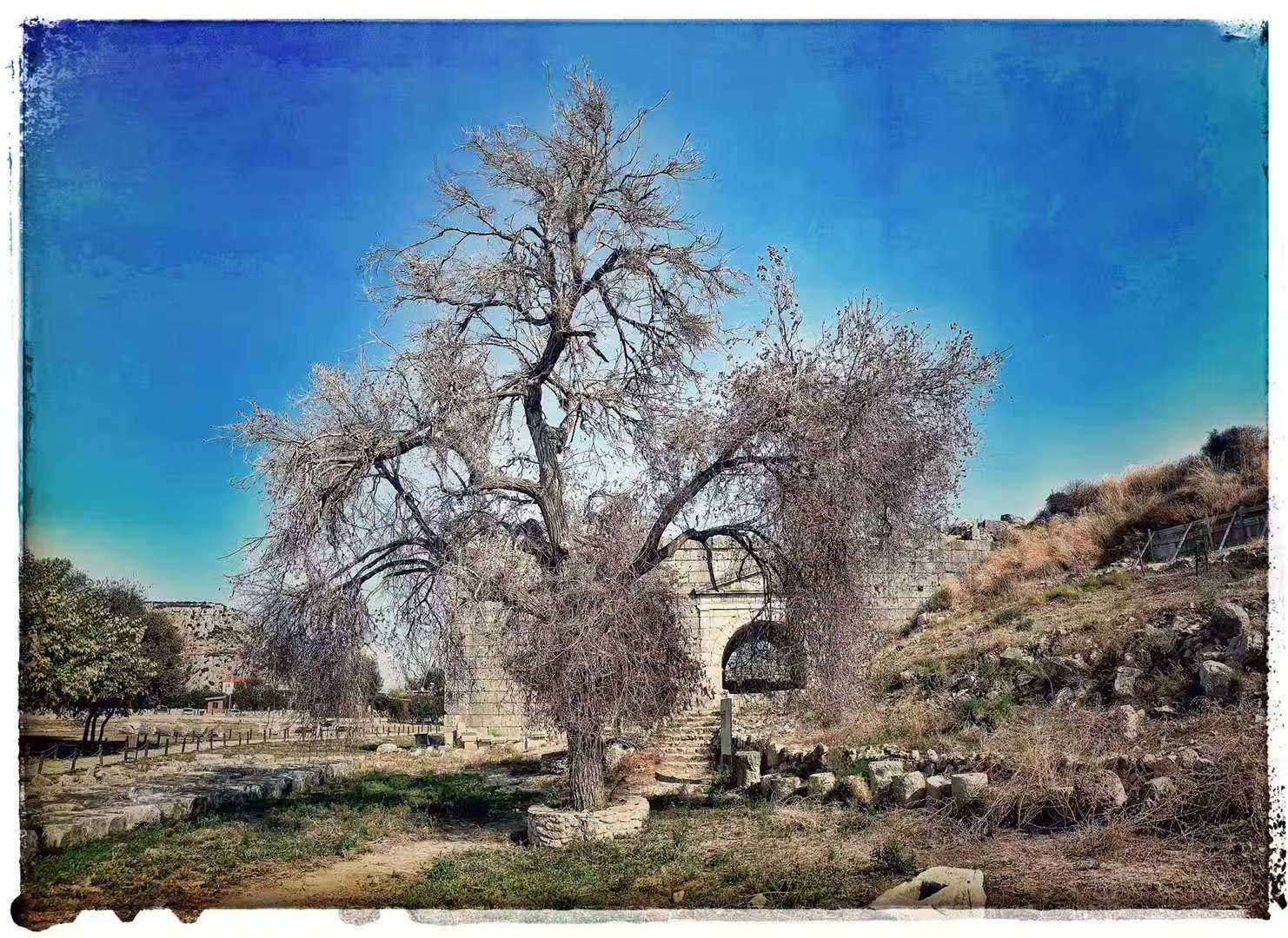 I passed two ancient cities. Ruins are no longer strange; I can almost reconstruct the streets at a glance. Up close, a king’s sarcophagus raised high over a market lane testifies to past glory—bones long gone, yet this mansion for the soul seems to wait for its master’s return. The theatre here was truly an amphitheatre; backstage beast pens survive intact. A straight, level avenue runs through the city; a broken gate struggles out of trees to show its upper arch. Legend says 2,300 years ago, under Persian pressure, the last king led the entire town to kill family, then themselves, burning treasure and palace before abandoning the city—tragic to the extreme, either too absolute in temper or fierce to the core.