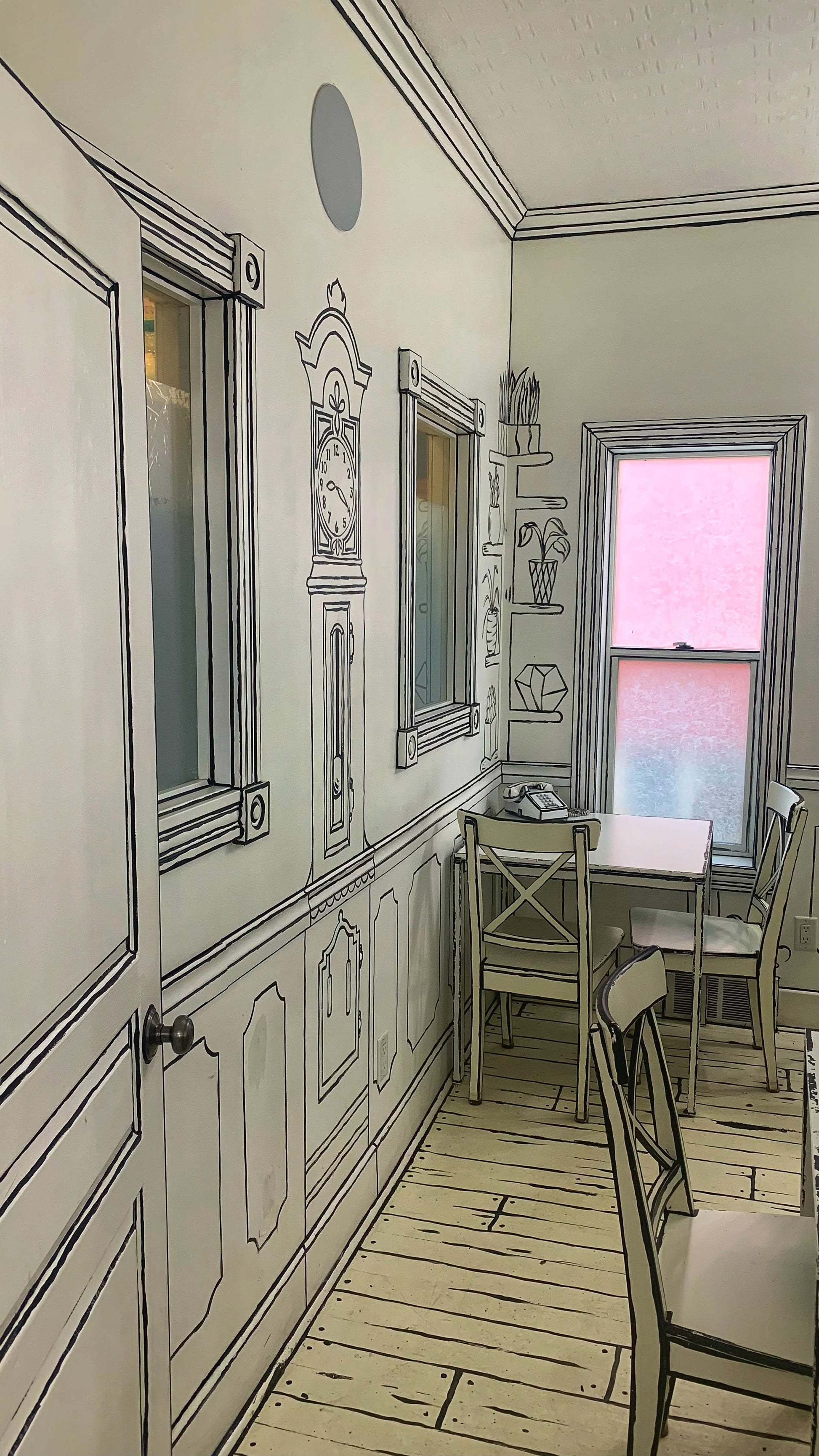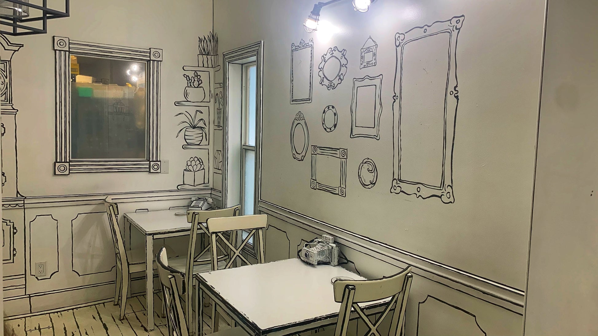 Two skeletons dance Halloween-style at the door, but inside it’s warm and sweet. Quirky outside, soft inside—very small-town North America. Black-and-white hand-drawn lines run through the space: walls like comics, tables like illustrations. Photos look flat like graphic art; step into the frame and you pop into unexpected 3D. One shop, another world.