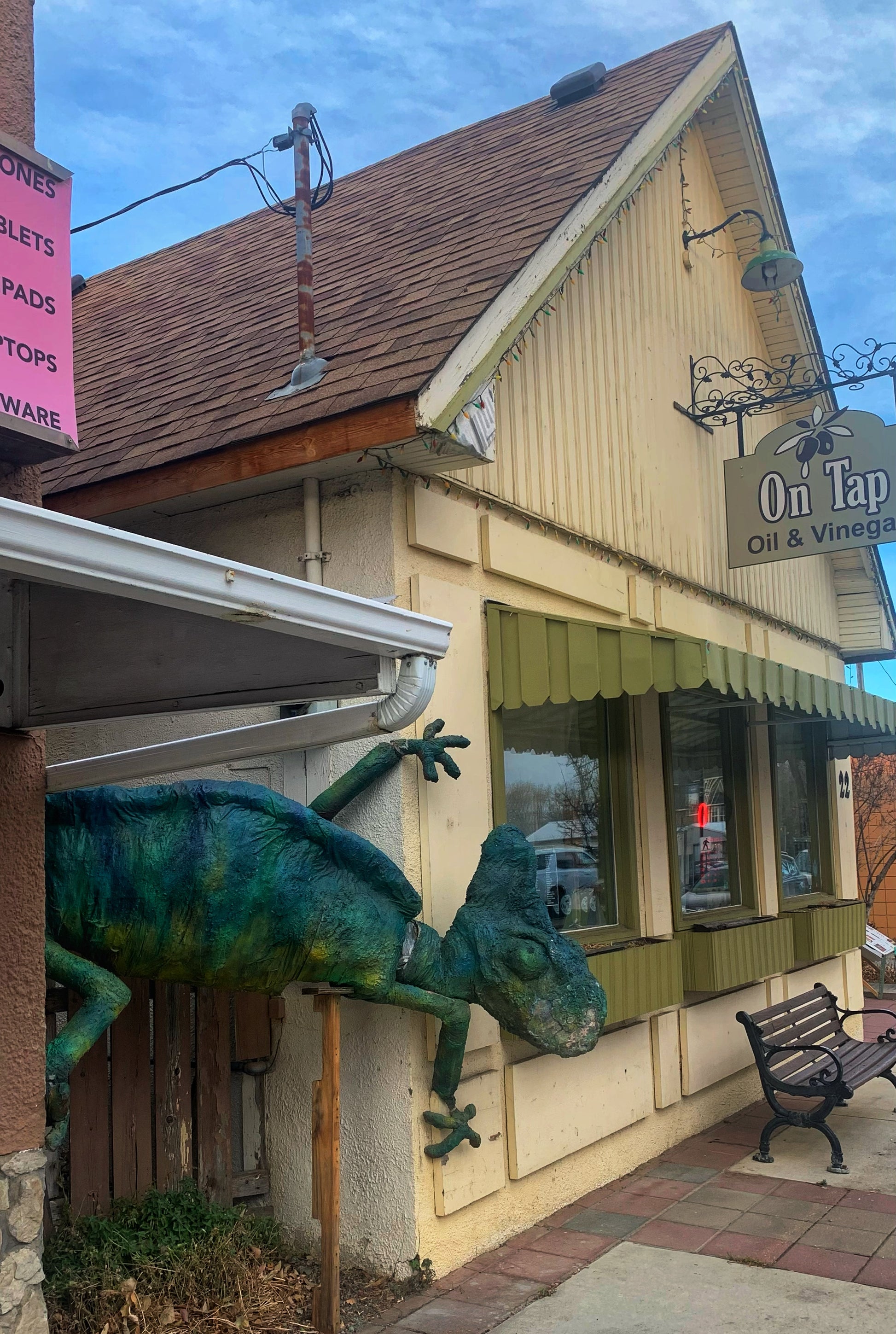 A giant chameleon peeks from a corner; there’s a 2D-comic-style café; a giant blue beach chair big enough for a titan; and a tiny museum frozen in time. A small town, yet full of playful surprises—enough to fill an entire day.